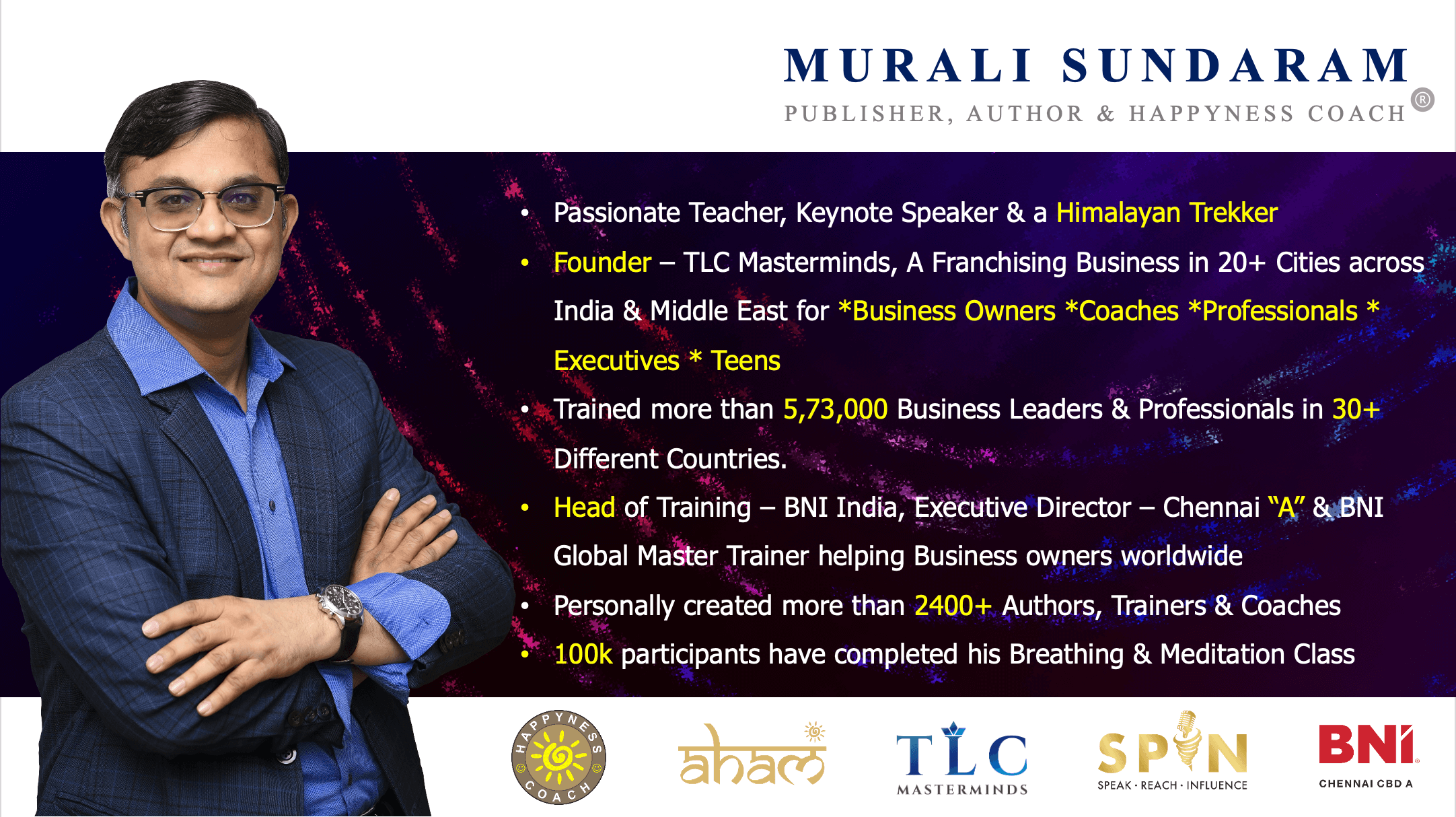 Hi, I’m Murali Sundaram, popularly known as the Happyness Coach. I help professionals, entrepreneurs, and professionals unlock their full potential through a unique blend of business mastery, personal transformation, and meditation practices.